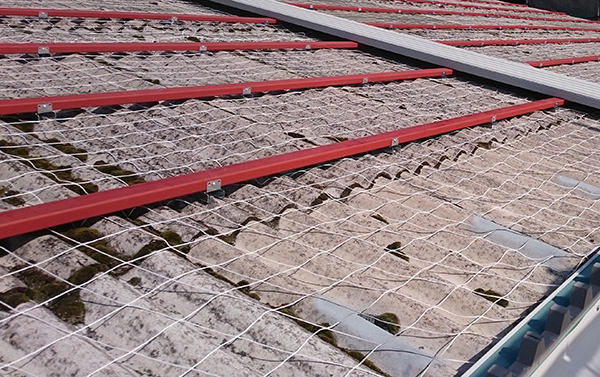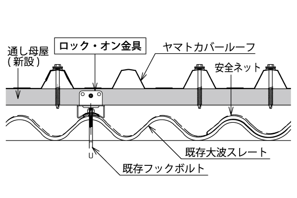 既設スレートのフックボルトにロック・オン金具を取付け、その上に母屋を新設してヤマトカバールーフを施工します。無塵工法により工事中でも屋内操業可能で切り粉が発生しません。